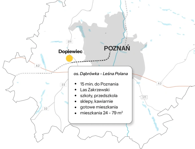 Zrobisz tu codzienne zakupy, wypijesz poranną kawę w kawiarni, a dziecko odprowadzisz do przedszkola, które znajduje się na osiedlu. Poranny terning? Jak najbardziej - mamy street workout, oraz 1000 ha lasu, gdzie możesz pobiegać. Osiedle Dąbrówka – Leśna Polana położone jest przy obwodnicy S11 oraz drodze A2, a w pobliżu znajdują się również przystanki kolejowe oraz autobusowe. Dzięki temu możesz szybko dotrzeć do dowolnego miejsca w Poznaniu.