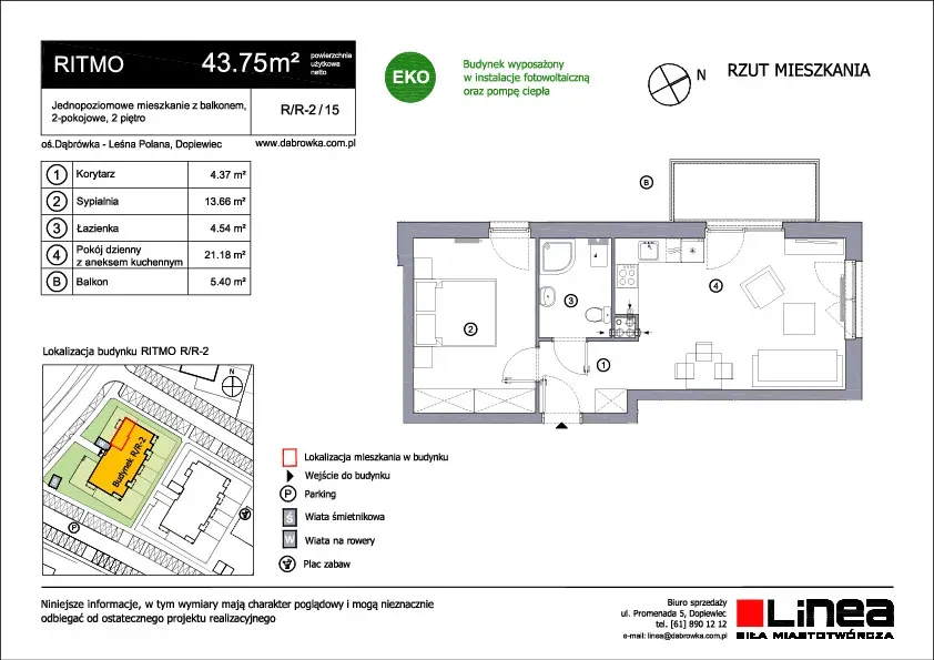 Ritmo to nowy typ wielorodzinnego budynku na osiedlu Dąbrówka - Leśna Polana. Zaprojektowalismy go z myślą o komforcie i zrównoważonym stylu życia mieszkańców naszego osiedla. W Ritmo będą znajdować się trzy kondygnacje z mieszkaniami o powierzchni od 28 do 52 m2, z jednym, dwoma lub trzema pokojami. Mieszkania na parterze tradycyjnie będą miały dostęp do urokliwych ogródków, natomiast te na wyższych kondygnacjach będą wyposażone w przestronne balkony. Zadzwoń lub napisz do nas, jeśli interesuje Cię oferta mieszkań Ritmo.