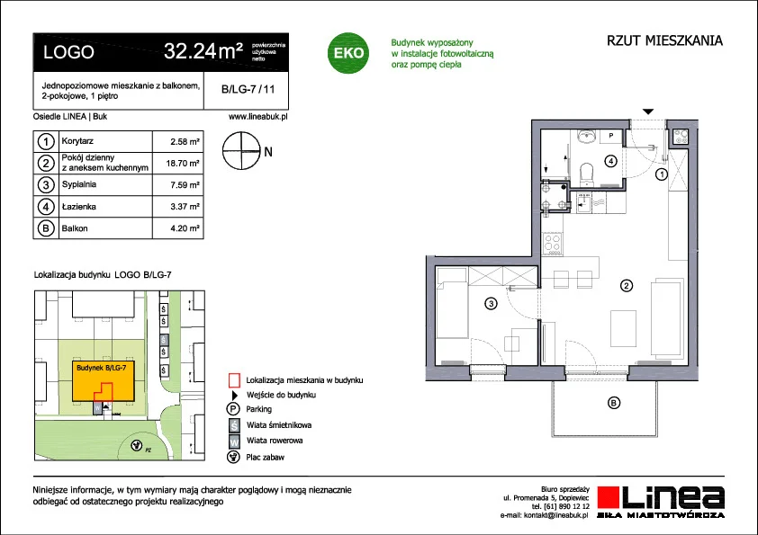 LOGO jest trzykondygnacyjnym budynkiem wielorodzinnym. Nowoczesna architektura, ustawne mieszkania i duży wybór niewielkich metraży sprawia, że każdy znajdzie tu coś dla siebie. Jeśli szukasz dobrze zaprojektowanej kawalerki lub mieszkania dwu lub trzypokojowego, to mieszkanie w LOGO spełni Twoje oczekiwania. Lokale na parterze posiadają własne ogródki, a te na piętrach balkony. Dodatkowo w budynku znajduje się wózkarnia i rowerownia.