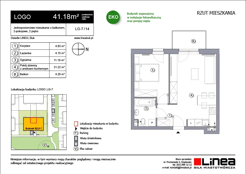 LOGO jest trzykondygnacyjnym budynkiem wielorodzinnym. Nowoczesna architektura, ustawne mieszkania i duży wybór niewielkich metraży sprawia, że każdy znajdzie tu coś dla siebie. Jeśli szukasz dobrze zaprojektowanej kawalerki lub mieszkania dwu lub trzypokojowego, to mieszkanie w LOGO spełni Twoje oczekiwania. Lokale na parterze posiadają własne ogródki, a te na piętrach balkony. Dodatkowo w budynku znajduje się wózkarnia i rowerownia.