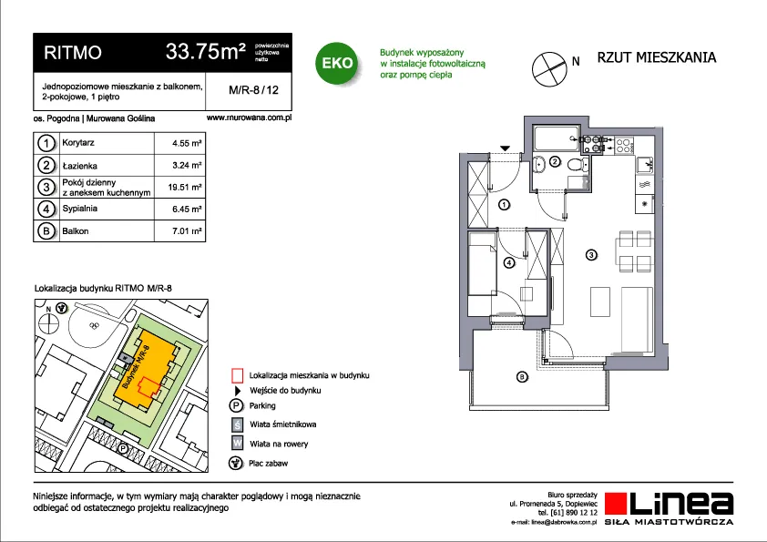 Ritmo to budynek wielorodzinny o trzech kondygnacjach zaprojektowany z myślą o komforcie i zrównoważonym stylu życia. Oferuje mieszkania o zróżnicowanej powierzchni, od 25 do 55 metrów kwadratowych, z jednym, dwoma lub trzema pokojami. Mieszkania na parterze wyróżniają się dostępem do urokliwych ogródków, które stanowią doskonałe miejsce do relaksu na świeżym powietrzu, organizacji spotkań towarzyskich czy stworzenia prywatnego ogrodu miejskiego. To unikalna możliwość cieszenia się naturą bez konieczności opuszczania własnego mieszkania. Natomiast mieszkania na wyższych kondygnacjach zostały wyposażone w przestronne balkony, które dodają im uroku i pozwalają mieszkańcom korzystać z widoków na otoczenie. Te przestrzenie zewnętrzne stanowią idealne miejsce do delektowania się poranną kawą czy wieczornym zachodem słońca. Ritmo to wyraz harmonii pomiędzy nowoczesnym designem a praktycznym podejściem do życia codziennego. Dzięki zróżnicowanym powierzchniom mieszkań, spełnia oczekiwania różnych grup mieszkańców, tworząc przy tym przyjazne i wspólne środowisko.