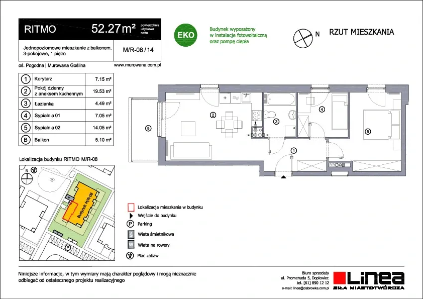 Ritmo to budynek wielorodzinny o trzech kondygnacjach zaprojektowany z myślą o komforcie i zrównoważonym stylu życia. Oferuje mieszkania o zróżnicowanej powierzchni, od 25 do 55 metrów kwadratowych, z jednym, dwoma lub trzema pokojami. Mieszkania na parterze wyróżniają się dostępem do urokliwych ogródków, które stanowią doskonałe miejsce do relaksu na świeżym powietrzu, organizacji spotkań towarzyskich czy stworzenia prywatnego ogrodu miejskiego. To unikalna możliwość cieszenia się naturą bez konieczności opuszczania własnego mieszkania. Natomiast mieszkania na wyższych kondygnacjach zostały wyposażone w przestronne balkony, które dodają im uroku i pozwalają mieszkańcom korzystać z widoków na otoczenie. Te przestrzenie zewnętrzne stanowią idealne miejsce do delektowania się poranną kawą czy wieczornym zachodem słońca. Ritmo to wyraz harmonii pomiędzy nowoczesnym designem a praktycznym podejściem do życia codziennego. Dzięki zróżnicowanym powierzchniom mieszkań, spełnia oczekiwania różnych grup mieszkańców, tworząc przy tym przyjazne i wspólne środowisko.