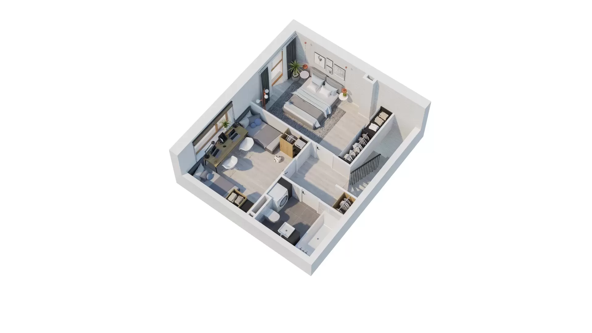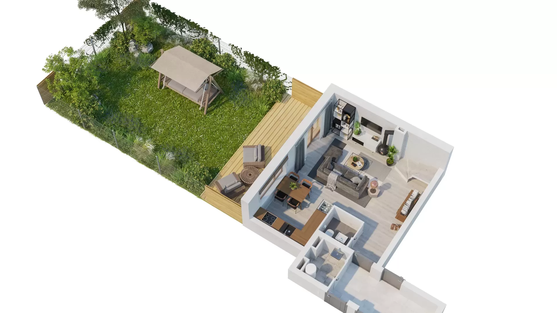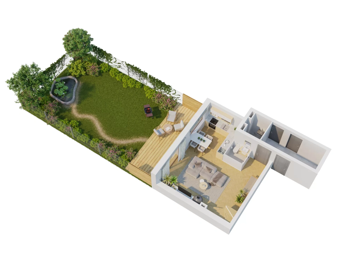 To szeregowiec z dwu-poziomowymi mieszkaniami. Każdy lokal ma tu swój ogród. Znajdziemy tu rozwiązania 3 lub 4 pokojowe. W ramach jednego wspólnego wejścia znajdują się cztery mieszkania o powierzchni 66 lub 79 moraz wspólny kocioł grzewczy dla wszystkich czterech mieszkań. Na parterze każdego z mieszkań znajduje się salon z aneksem kuchennym oraz toaleta. Na piętrze z kolei łazienka oraz dwie lub trzy sypialnie. Mieszkanie posiada możliwość zamontowania kominka i rolet zewnętrznych na parterze.