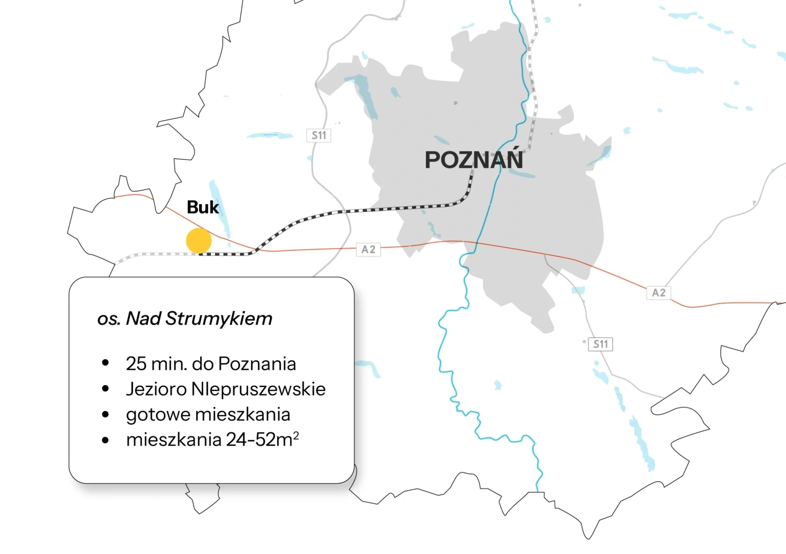 Osiedle Nad Strumykiem zlokalizowane jest nieopodal stacji kolejowej, z której w niecałe 30 minut dotrzesz do centrum Poznania nowoczesnym szynobusem. Szybki dojazd na lotnisko „Ławica” zapewnia mieszkańcom zmodernizowana droga wojewódzka nr 307, a 3 km od centrum miasta znajduje się węzeł A2. Zaledwie 10 km od węzła „Buk” przebiega obwodnica Poznania, będąca odcinkiem drogi krajowej S-11 łączącej północ i południe kraju.